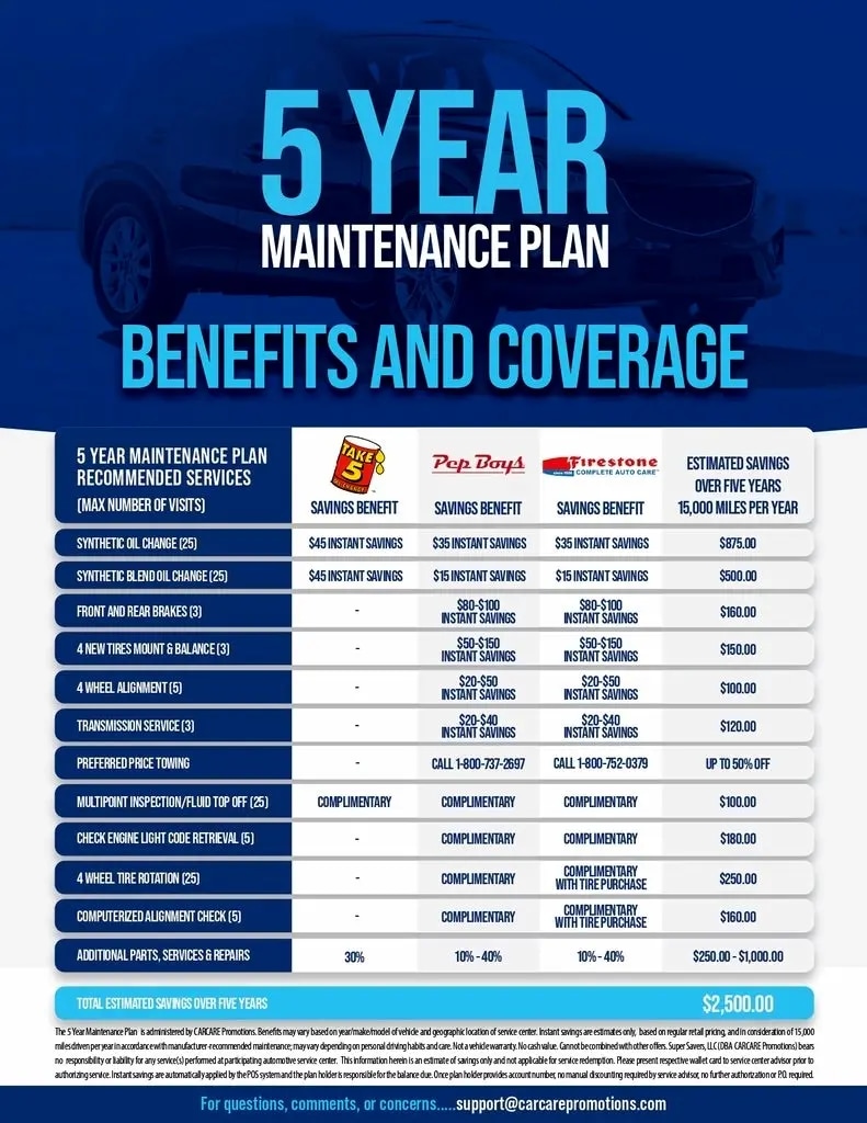 Autostrade is pleased to offer a complimentary 5 Year Maintenance Plan as an added perk for purchasing a vehicle from us. The 5 Year Maintenance Plan includes significant savings on oil changes, tire rotations, wheel alignments, brakes, radiator service, air conditioning service, and much more at participating national-brand service centers.