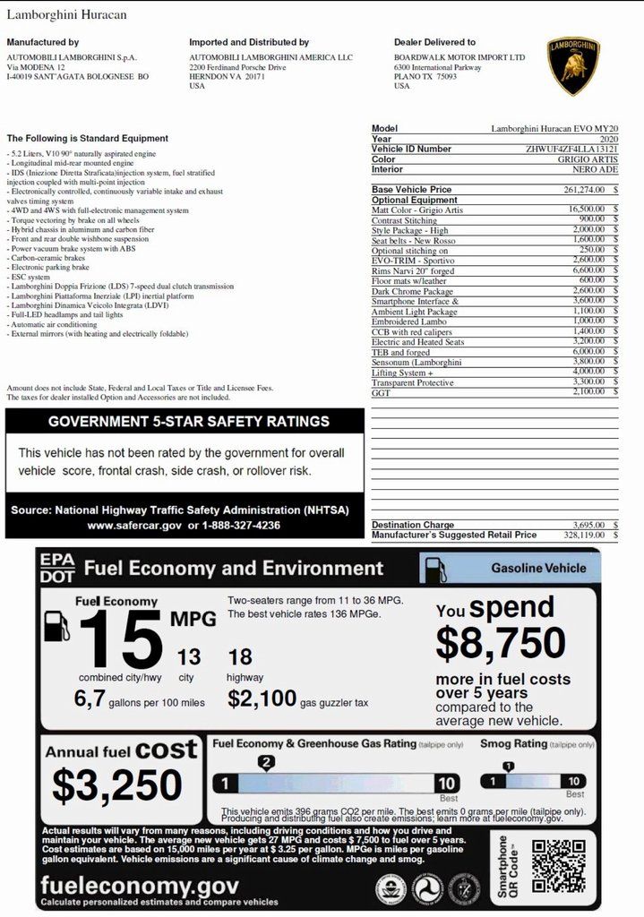 AUTOSTRADE is proud to present you with another True Market Priced Pre-Owned Vehicle. This 2020 Lamborghini Huracan EVO is loaded with the following Factory Options:4 Speakers, 4-Wheel Disc Brakes, ABS brakes, Adaptive suspension, Air Conditioning, Alloy wheels, AM/FM radio, Apple CarPlay/Android Auto, Auto-dimming Rear-View mirror, Automatic temperature control, Bumpers: body-color, Ceramic disc brakes: front and rear, Driver door bin, Driver vanity mirror, Dual front impact airbags, Dual front side impact airbags, Electronic Stability Control, Exterior Parking Camera Rear, Four wheel independent suspension, Front anti-roll bar, Front Bucket Seats, Front Center Armrest, Front dual zone A/C, Front reading lights, Fully automatic headlights, Garage door transmitter, Headlight cleaning, Heated door mirrors, Illuminated entry, Leather steering wheel, Low tire pressure warning, Navigation System, Occupant sensing airbag, Outside temperature display, Passenger door bin, Passenger vanity mirror, Power door mirrors, Power driver seat, Power passenger seat, Power steering, Power windows, Radio data system, Radio: Lamborghini Touch-Screen Infotainment System, Rear anti-roll bar, Remote keyless entry, Satellite Tuner (SDARS), Security system, Speed control, Speed-sensing steering, Spoiler, Sport Seats, Sport steering wheel, Tachometer, Telescoping steering wheel, Tilt steering wheel, Traction control, Trip computer, Unicolor Smooth Leather Seat Trim, Variably intermittent wipers, Voltmeter, and Wheels: 20" x 8.5J Fr & 20" x 11J Rr Giano Silver.